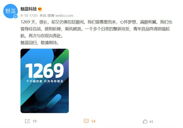 时隔 1269 天,约3年半的时间,魅蓝官方微博宣布魅蓝正式回归。