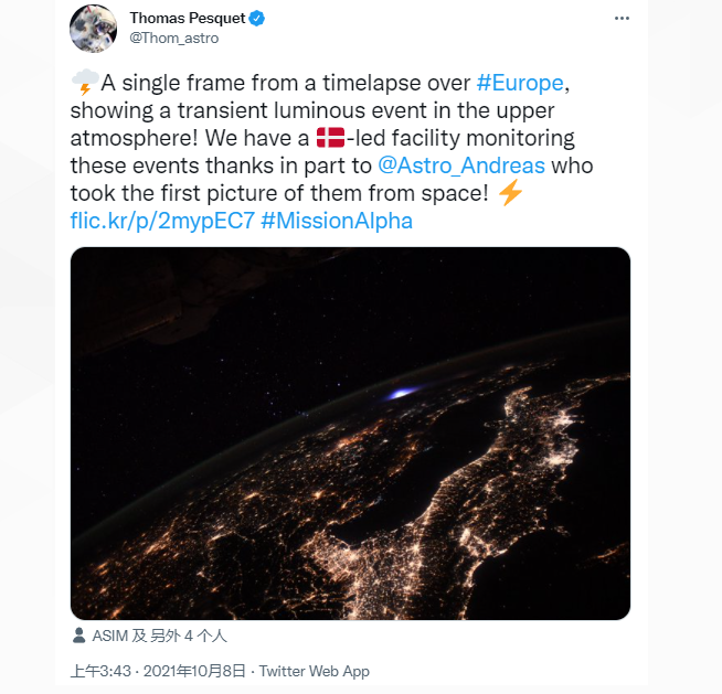 “瞬态发光事件”是由上大气层的闪电引起的。这一次事件发生在9月初,Pesquet本周在推文中提到了它,称它是”非常罕见的事件”。