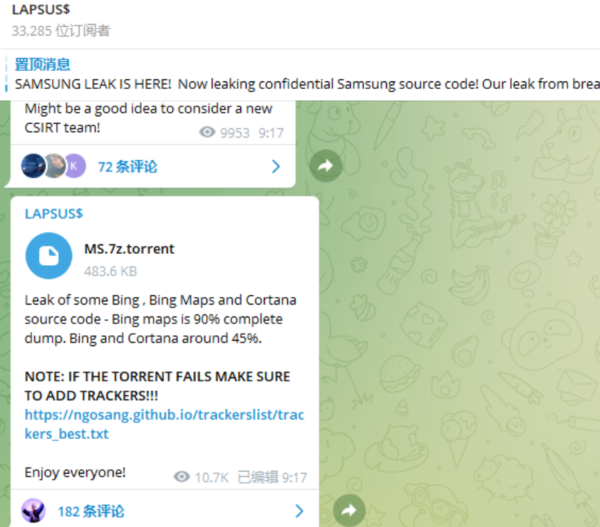 周一晚上,Lapsus$ 发布了一个经 7zip 压缩后大小为 9GB 的种子文件,其中包含他们声称属于微软的 250 多个项目的源代码。在发布种子文件时,该黑客组织表示,此文件包含 90% 的 Bing Maps 转储日志 (dump) 和大约 45% 的 Bing 和 Cortana 转储日志。