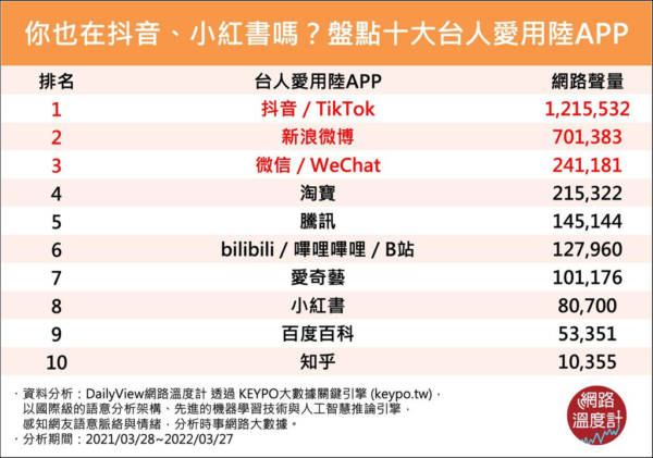 该网站说明,本调查研究数据由“KEYPO大数据关键引擎”提供,分析时间范围为2021年03月28日至2022年03月27日,共一年。系统观测上万个岛内网站频道,包括各大新闻频道、社交平台、讨论区及部落格等,针对讨论“台人爱用陆APP”相关文本进行分析,并根据网友就该议题的讨论,作为本分析依据。