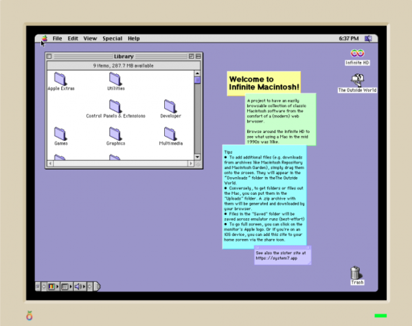 苹果Mac OS(现在写作macOS)同样历史悠久,但对于一些几乎只接触Windows的朋友来说,可能至今都没有体验过。日前,软件工程师Mihai Parparita基于Basilisk II网页模拟器,将经典的Mac OS 7(System 7)、Mac OS 8以网页标签的形式呈现出来。如果你很好奇早期的苹果桌面系统或者是个怀旧派,不妨尝试。