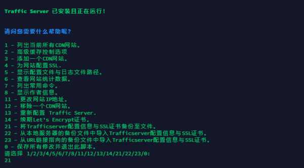 - 该脚本会提示自动编译安装Traffic Server. 安装完毕后,程序会引导新建CDN网站,自动签发SSL等等。您需要将您网站的域名设置A记录解析到这台VPS的IP地址上。您也可以随时重新运行该脚本,用来管理您的服务器上部署的CDN网站,查看网站统计等等。