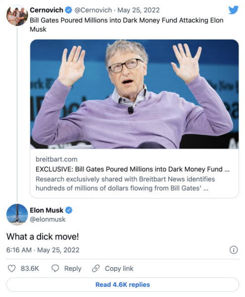 5月25日,极右翼出版物《布莱巴特新闻》声称,数亿美元从盖茨基金会流向了 26 个组织中的 11 个,这些组织上个月签署了一封公开信,敦促Twitter广告商抵制该公司,如果埃隆马斯克恢复该平台上的言论自由。