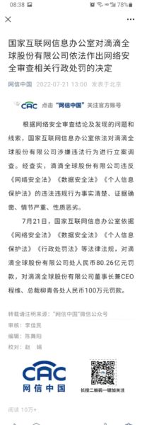 罚款80.26亿元!国家互联网信息办公室对滴滴全球股份有限公司依法作出网络安全审查相关行政处罚的决定 由 刘春晓 · 2022年7月21日 根据网络安全审查结论及发现的问题和线索,国家互联网信息办公室依法对滴滴全球股份有限公司涉嫌违法行为进行立案调查。经查实,滴滴全球股份有限公司违反《网络安全法》《数据安全法》《个人信息保护法》的违法违规行为事实清楚、证据确凿、情节严重、性质恶劣。 7月21日,国家互联网信息办公室依据《网络安全法》《数据安全法》《个人信息保护法》《行政处罚法》等法律法规,对滴滴全球股份有限公司处人民币80.26亿元罚款,对滴滴全球股份有限公司董事长兼CEO程维、总裁柳青各处人民币100万元罚款。 分享至: 广而告之:欢迎注册币安BINANCE虚拟货币交易所!