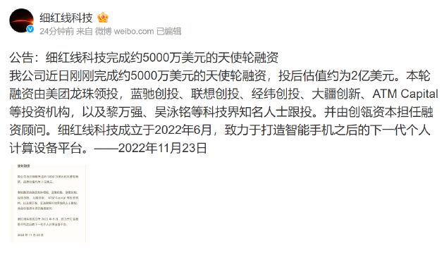 11 月 23 日消息,今日,罗永浩 AR 创业公司细红线科技宣布近日刚刚完成约 5000 万美元(约 3.57 亿元人民币)的天使轮融资,投后估值约为 2 亿美元(约 14.28 亿元人民币)。