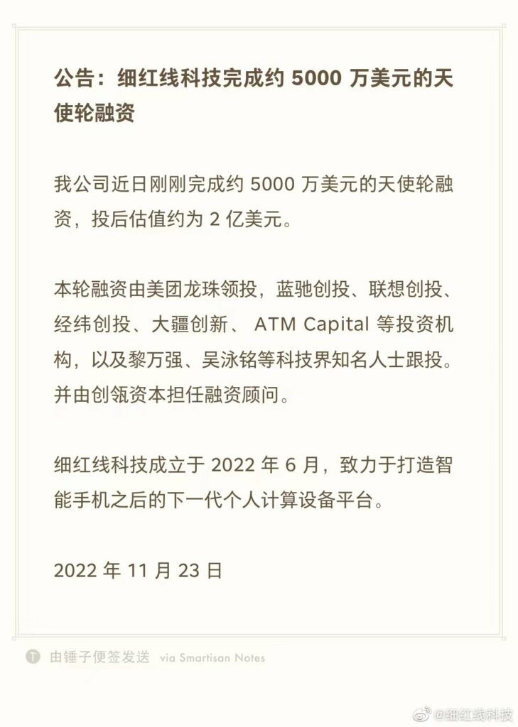 细红线科技表示,公司成立于 2022 年 6 月,致力于打造智能手机之后的下一代个人计算设备平台。