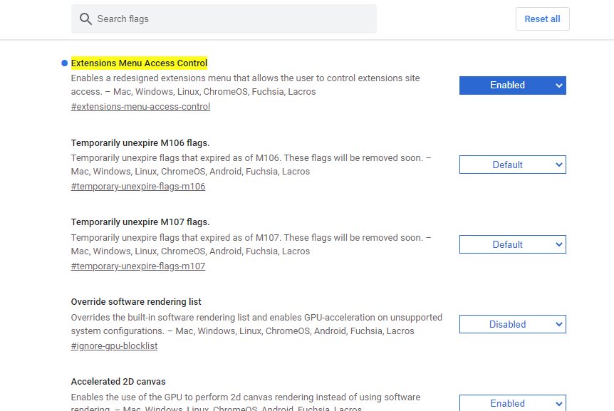 将 Extensions Menu Access Control 实验功能的状态更改为 Enabled