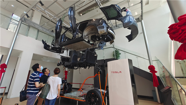 现场可以看到,一辆Model Y悬空而挂,完全“拆解”,最大化呈现车身结构细节,揭开特斯拉低能耗、高效率的秘密。