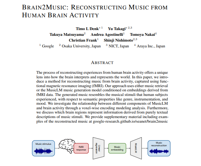 Brain2Music 基于谷歌此前推出的 MusicLM 模型(基于文本生成音乐片段),基于 fMRI 生成 15 秒音乐片段。