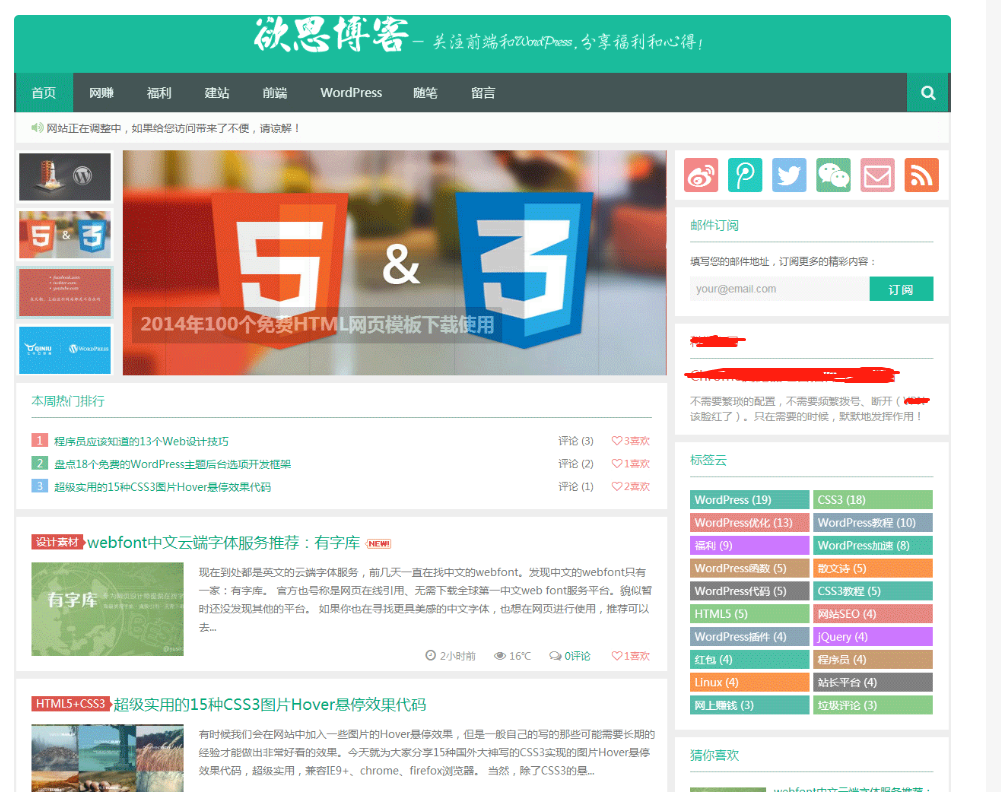 - 侧栏小工具:邮箱订阅+标签云+特别推荐等
