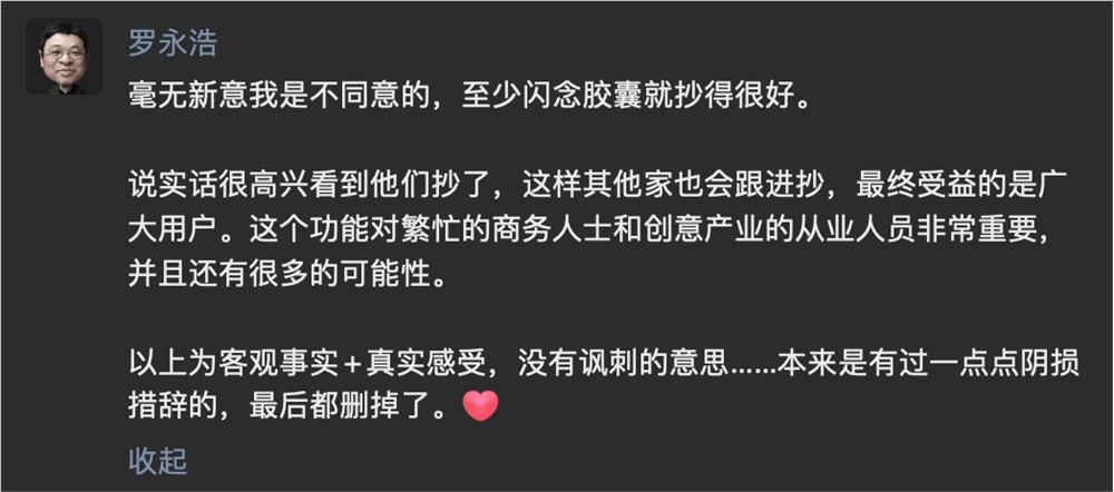 罗永浩认为,尽管有人认为iPhone15缺乏新意,但他觉得闪念胶囊这个功能抄得很好。他指出,这个功能对于商务人士和创意产业的从业人员非常实用,且具有更多可能性。