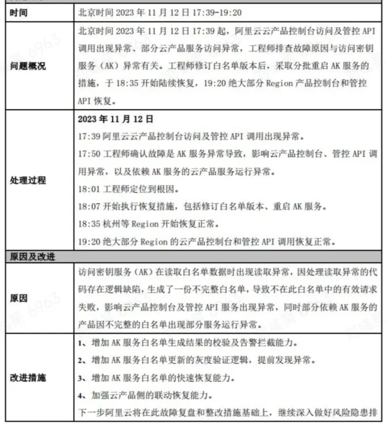 2023 年 11 月 12 日 17:39 起,阿里云云产品控制台访问及管控 API 调用出现异常、部分云产品服务访问异常,工程师排查故障原因与访问密钥服务 (AK) 异常有关。工程师修订白名单版本后,采取分批重启 AK 服务的措施,于 18:35 开始陆续恢复,19:20 绝大部分 Region 产品控制台和管控 API 恢复。