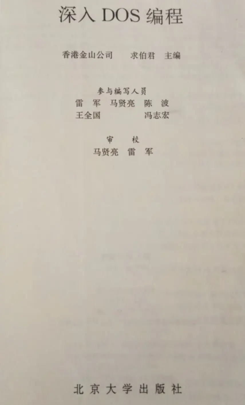 1992 年,雷军还与求伯君合著了《深入 DOS 编程》一书。在接下来的两年里,雷军涉猎广泛,写过加密软件、杀毒软件、财务软件、CAD 软件、中文系统以及各种实用小工具等。