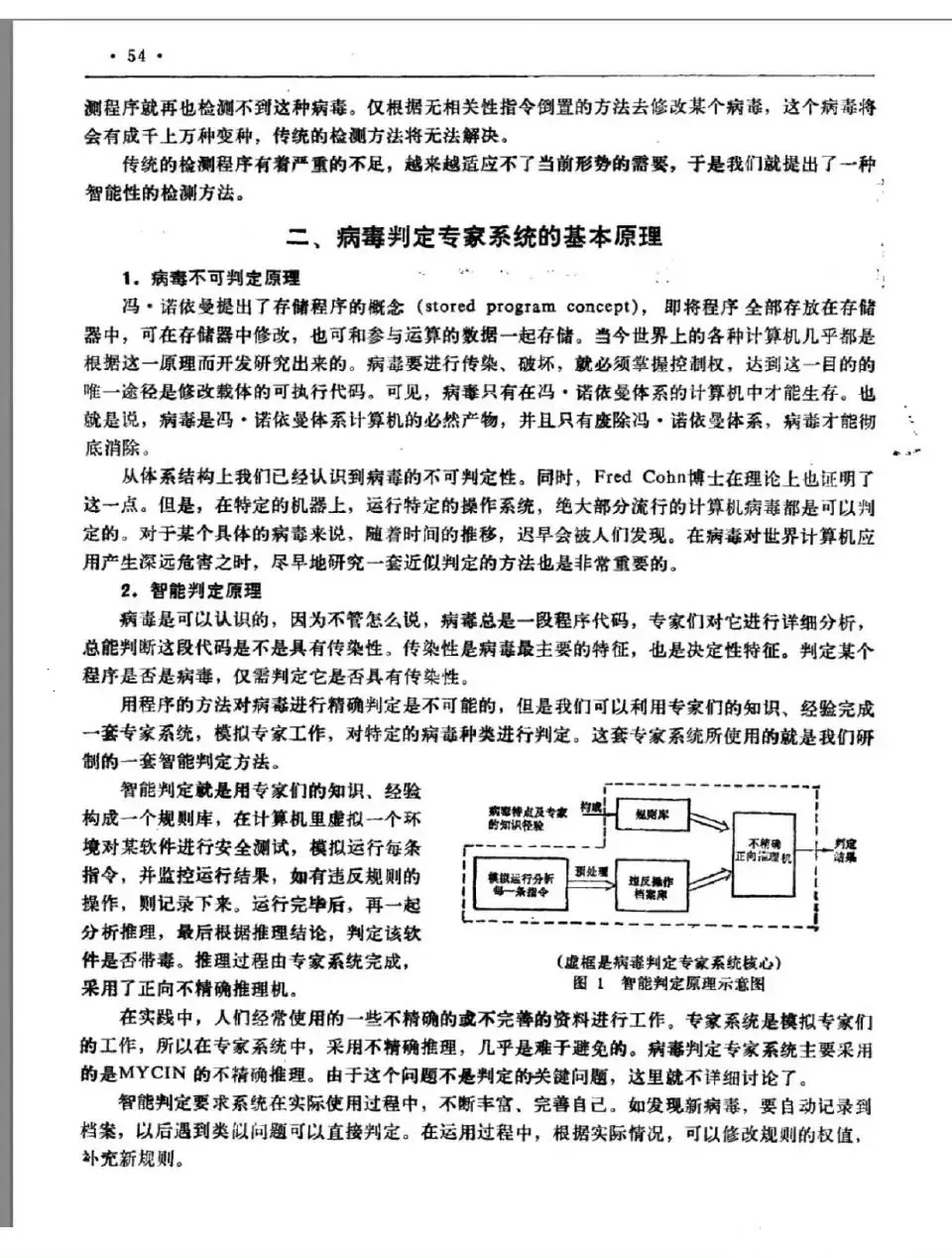 这份论文详细地描述了计算机病毒判定专家系统的原理与具体设计方法,一定程度上解决了流行病毒的判定问题。论文结语写道:研制解决流行病毒判定问题的专家系统,在目前具有相当大的使用价值。本文介绍的这种智能判定方法大大优于传统的检测方法,具有准确率高,适用性广的有点,还可以不断发展和扩充。关于这种方法,目前国内外文献上尚未提及。(参考文献略)