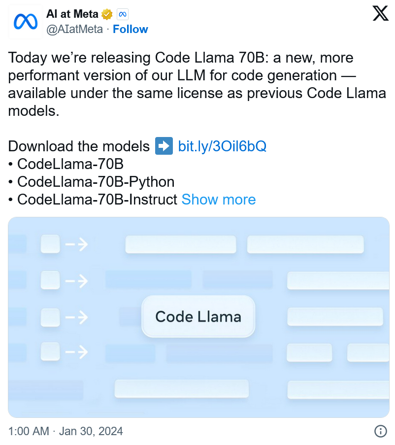 1月30日,该公司发布了”功能更强大的新版本”–Code Llama 70B。