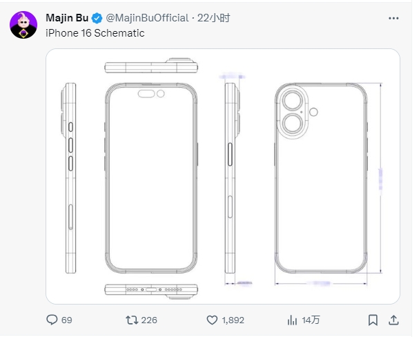 2 月 5 日消息,X 平台消息源 Majin Bu 今日分享了“疑似苹果 iPhone 16 手机”的设计图,之后外媒 theapplehub 以此制作了系列手机的渲染图。
