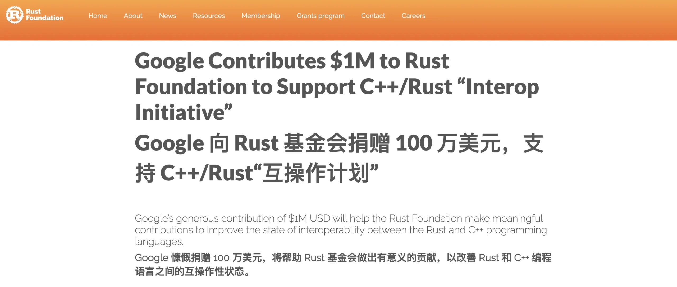 谷歌宣布向 Rust 基金会捐赠 100 万美元,这笔资金将用于支持名为 “Interop Initiative” 的新计划 —— 专注提升 C++ 与 Rust 互操作性。