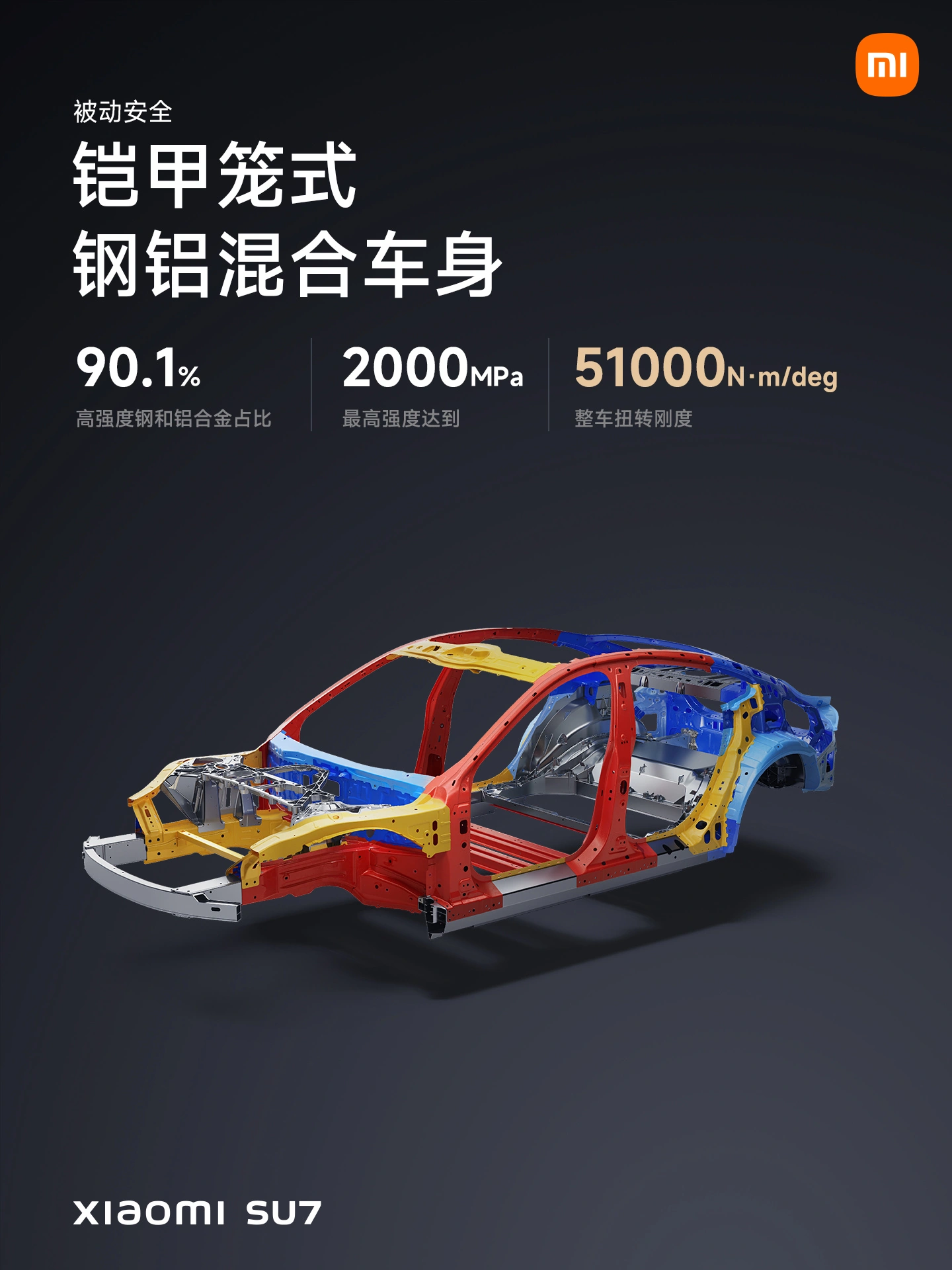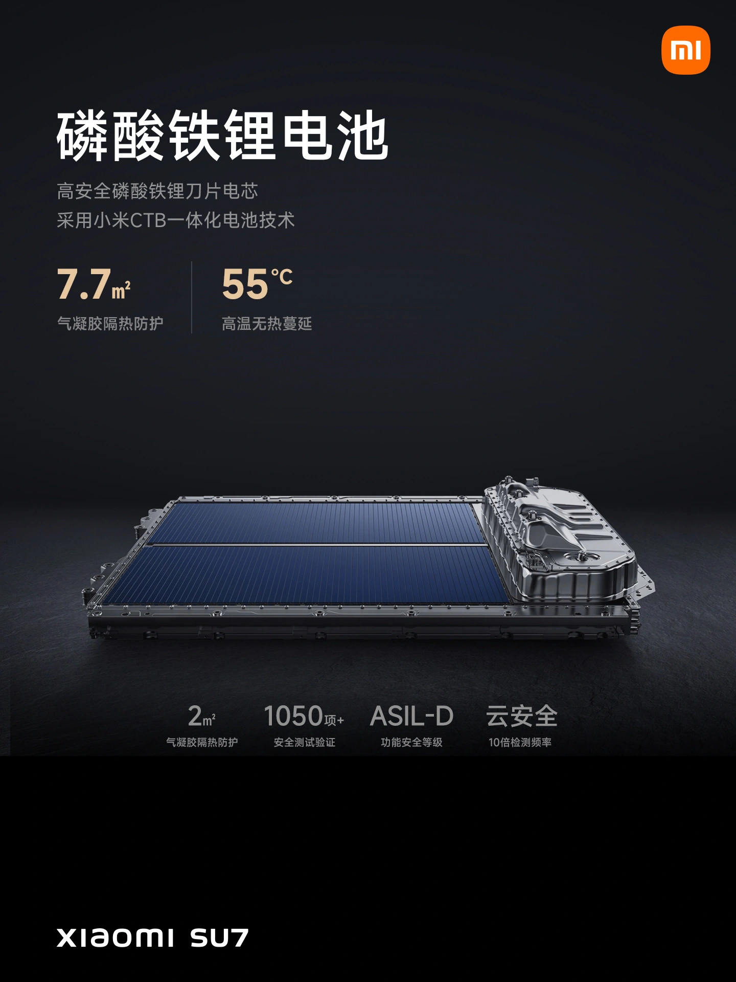安全方面,小米 SU7 采用铠甲笼式钢铝混合车身,内置 7 个安全气囊;全系标配 16 项主动安全配置;超 1050 项电池安全测试验证;多账户隐私隔离,支持一键隐私模式。