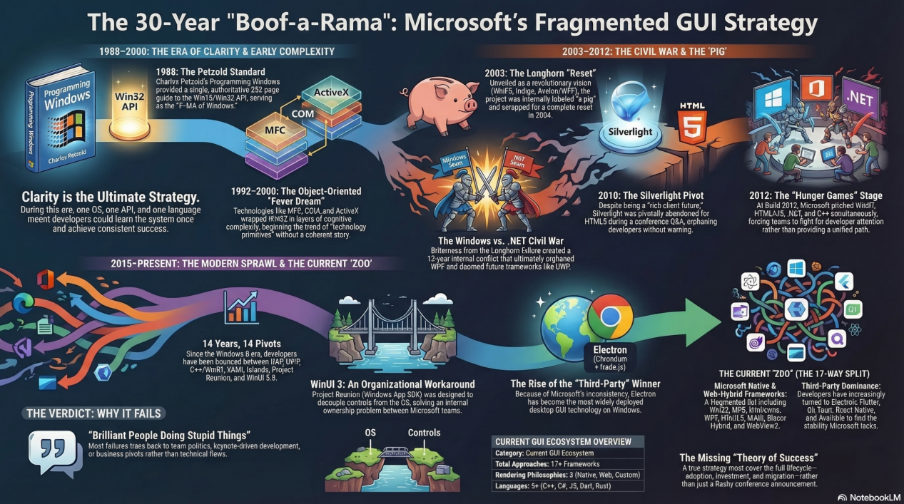 前微软CTO、在微软效力23年的Jeffrey Snover近日发布长篇博文,系统梳理了微软过去数十年间在GUI(图形用户界面)上的反复摇摆,揭示了Windows开发生态为何走向碎片化的原因。