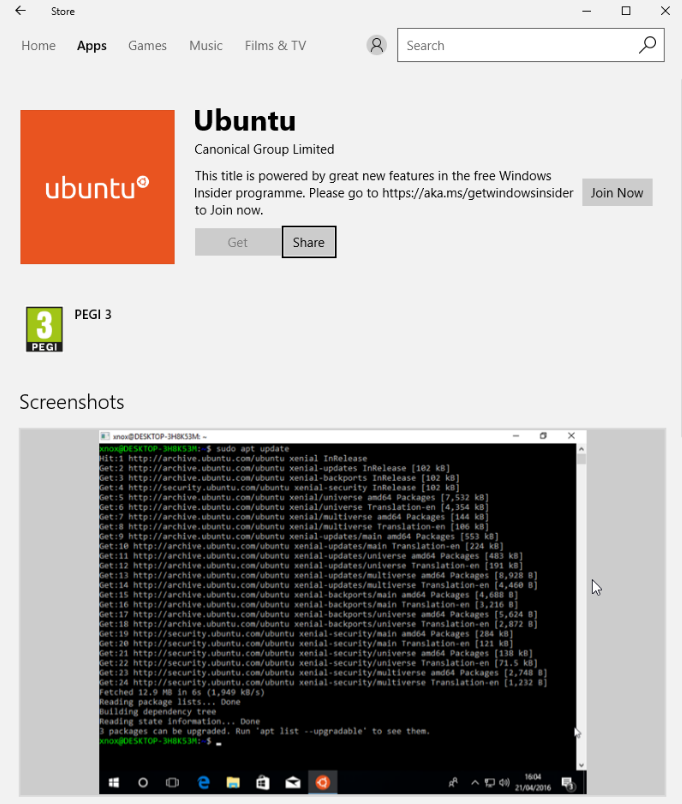 不过,这次 Canonical 正式发布的公告是以 “Windows 10 Loves Ubuntu[1]” 为题,显然是呼应了之前微软 CEO 萨提亚的口号“Microsoft Love Linux”。在该公告中,正式宣布了其 Ubuntu 16.04 LTS 以应用的方式出现在 Windows 10 商店中,不过只有使用最新的 Windows Insider 构建版本才能使用。