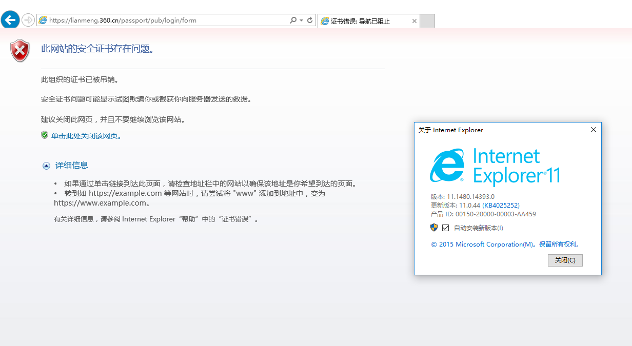 360联盟网站https证书存在问题被吊销,无法通过IE访问 由 刘春晓 · 2017年7月20日 使用的是win10平台,IE11浏览器 分享至: 广而告之:欢迎注册币安BINANCE虚拟货币交易所!