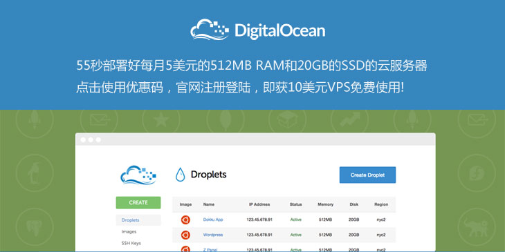 digitalocean创始于2012年,最开始只有4到5台服务器,只有少量工程师。digitalocean用KVM虚拟,配置高性能的SSD做储存,加上服务器配备的是1000M端口,以512M内存为起点,月付最低低至5美元。