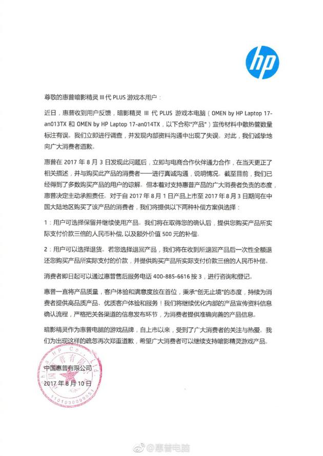 惠普在申明中表示:惠普针对对2017年8月1日-3日在中国大陆地区购买了该产品的消费者,提供以下两种赔偿方案: