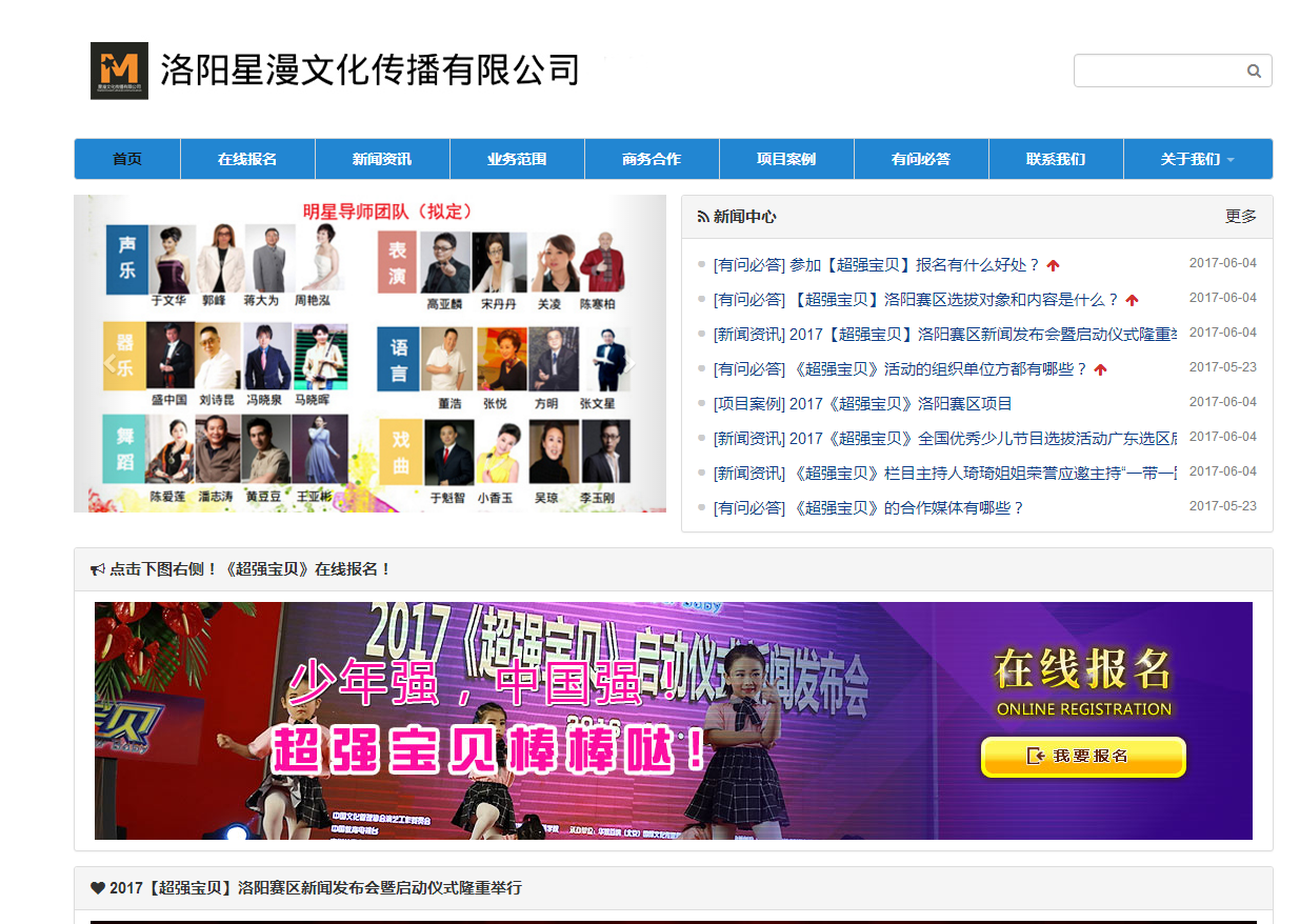 2017年6月,我们为超强宝贝洛阳赛区总代理:洛阳星漫文化传播有限公司制作了官方网站:www.xingmanmedia.com 。