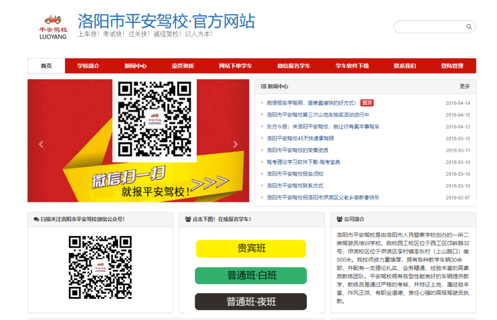 2016年4月,给洛阳市平安驾校制作企业官网,并负责域名、网站LOGO和网站主机托管,直到现在运行稳定安全。