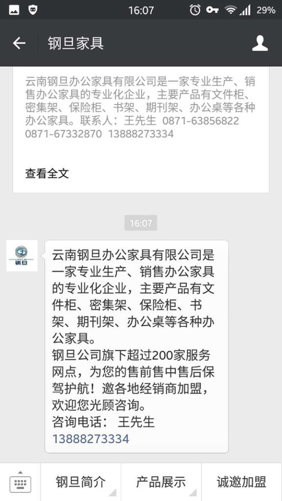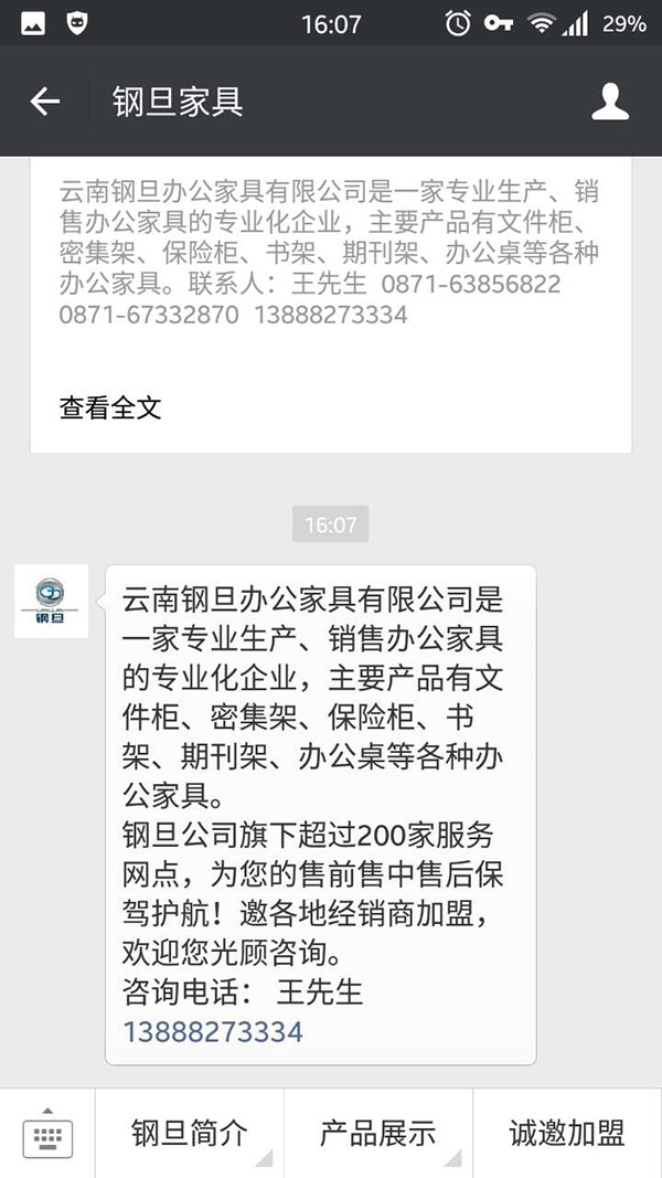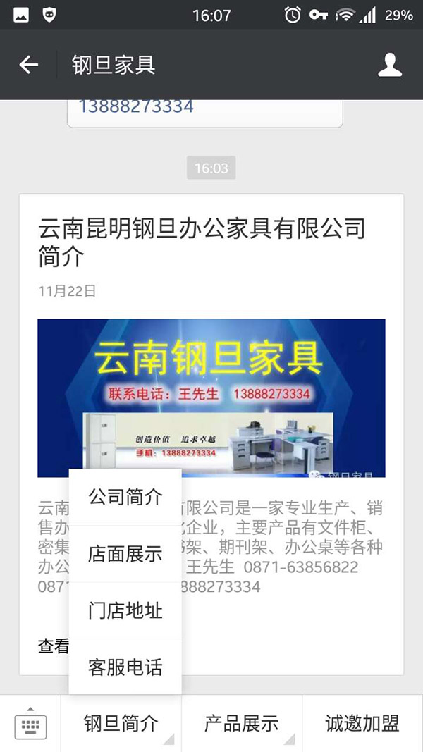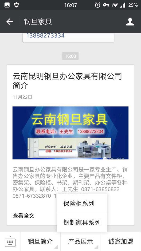 2015年11月,给朋友的公司:云南钢旦办公家具有限公司,建设了微信服务号的企业微信官网,如下图。